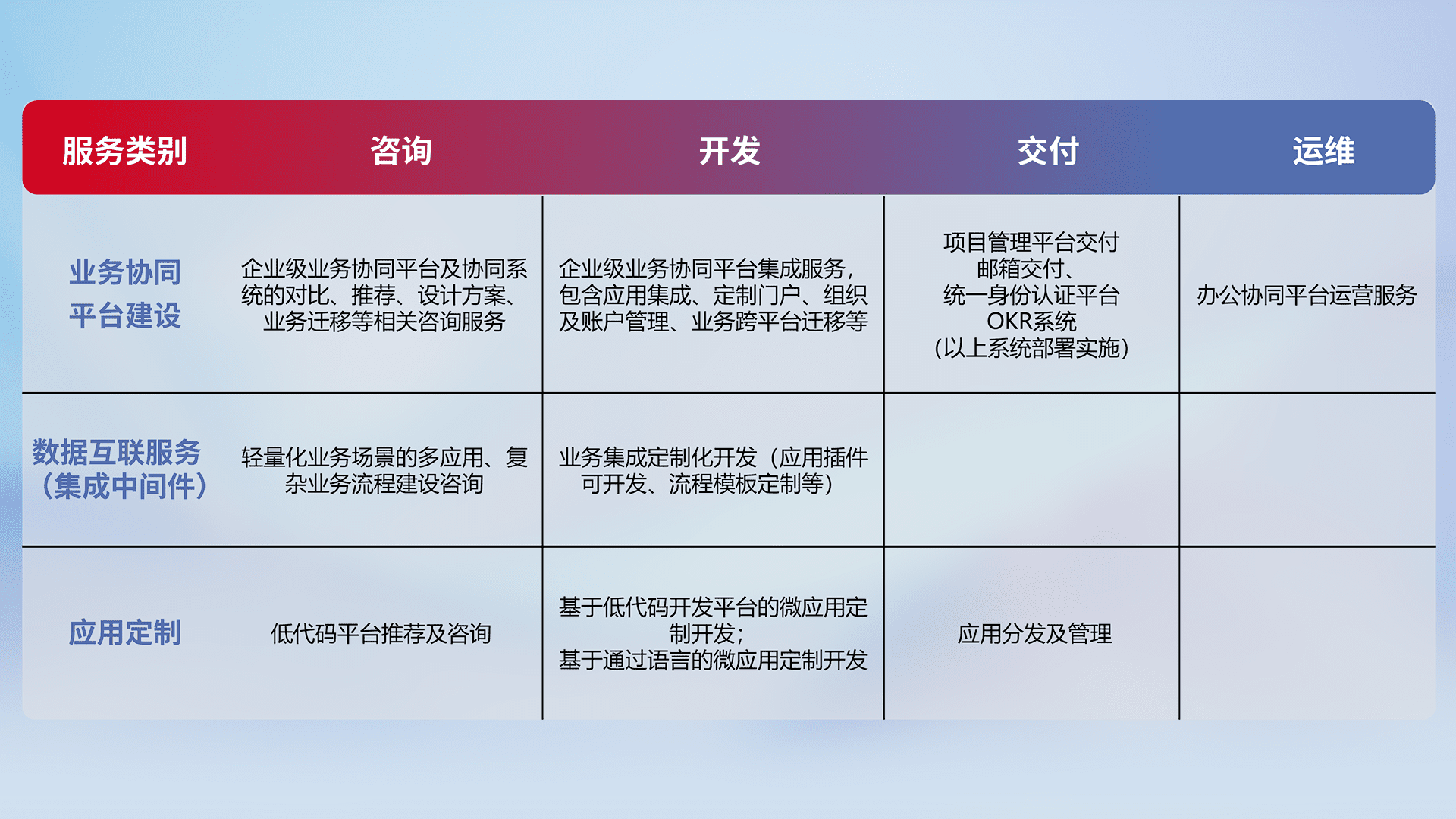 针对钉钉、、、企微、、、、IDaas等平台级产品提供产品的规划、、、方案、、、、交付、、、定制化开发等服务,,,实现如统一协同办公、、智能客户服务、、混合会议管理、、、智能数据查询、、、等业务场景,,,,实现数字化转型。。。